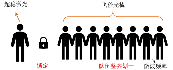 如果把超穩(wěn)光生微波源比作排隊(duì)走的隊(duì)列,那么超穩(wěn)激光就像隊(duì)列里面的帶隊(duì)人,隊(duì)伍的步伐大小、整齊度、每位隊(duì)員的相對(duì)位置都由這個(gè)領(lǐng)隊(duì)決定。飛秒光梳就像隊(duì)列里面的隊(duì)員,在沒(méi)有和超穩(wěn)激光建立聯(lián)系之前,光梳是自由運(yùn)轉(zhuǎn)的,就如圖 6中所示的一樣混亂。而當(dāng)通過(guò)一系列復(fù)雜的操作和領(lǐng)隊(duì)建立聯(lián)系后,就能使得每位隊(duì)員的步伐大小、步速、以及和其他隊(duì)員的相對(duì)位置都和領(lǐng)隊(duì)高度同步,如同圖 7所示,這樣就產(chǎn)生的超穩(wěn)光生微波信號(hào)。