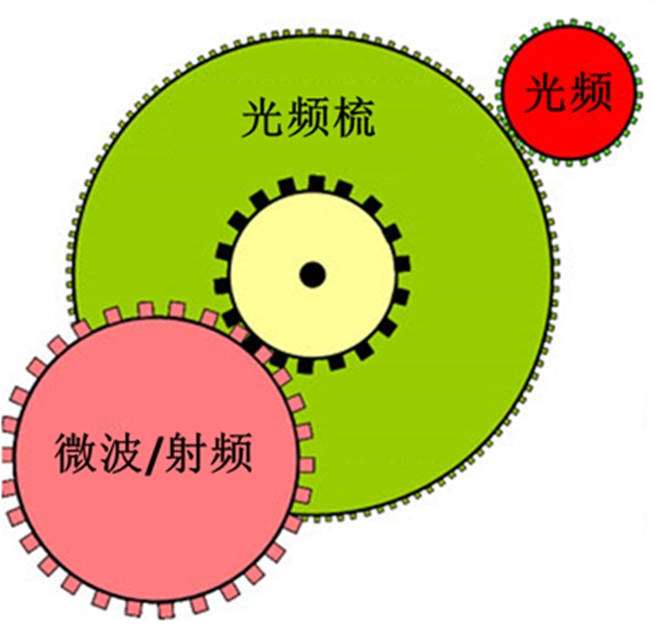雖然激光的頻率很穩(wěn)定,但是激光的頻率卻很高,和微波頻率相比,一般要差5、6個(gè)數(shù)量級(jí)。因此無(wú)法直接對(duì)激光進(jìn)行分頻而抑制了光生微波技術(shù)的發(fā)展。而在2000年, Theodor W. H?nsch教授和John L. Hall教授發(fā)明了光學(xué)頻率梳[3][4],就像一個(gè)齒輪組(如圖 9),既可以嚙合激光頻率,又可以連接微波頻率,可以直接對(duì)超穩(wěn)激光進(jìn)行分頻至微波頻率,這項(xiàng)技術(shù)的發(fā)明使得光生微波成為可能。這兩位科學(xué)家也因?yàn)榘l(fā)明光梳而分享了2005年諾貝爾物理學(xué)獎(jiǎng)。