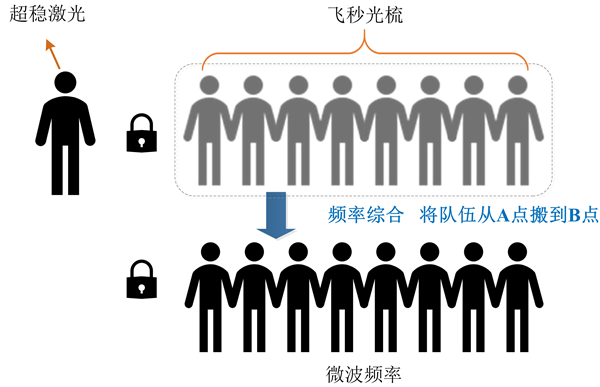 超穩(wěn)光生微波源主要由超穩(wěn)激光器、飛秒光學(xué)頻率梳和微波頻率綜合器這三部分組成,如圖 5所示。超穩(wěn)激光器提供超級(jí)穩(wěn)定的單頻激光信號(hào),它是超穩(wěn)微波的參考源,它的頻率穩(wěn)定度制約著所產(chǎn)生的微波的頻率穩(wěn)定度。飛秒光學(xué)頻率梳用來(lái)搭建一條連接超穩(wěn)激光信號(hào)和超穩(wěn)微波信號(hào)的橋梁,讓超穩(wěn)激光直接將頻率穩(wěn)定度傳承給超穩(wěn)微波,得到光生微波信號(hào)。微波頻率綜合器,可以將飛秒光梳傳遞的微波信號(hào)變換至任意希望的頻率值上。